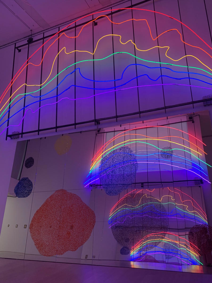 The title of Sarkis' exhibition, which opened at Arter on May 4th, 2023 and will continue until February 4th, 2024, is 'Infinite'. While wandering around the world created by Sarkis, I had a chance to perceive what it means to resist despair by indulging into a fusion of sound, light and form that creates a sense of a balm to our souls. It is as if Sarkis is looking at the sufferings of humanity from the seat of infinity and invites the viewer to that seat for a while. In the exhibition space, the viewer is greeted by a wheelchair covered with feathers and black fingerprints transferred onto a mirror. While the wheelchair carries an experience of pain, the feathers on it add a soothing element to that experience. The black fingerprints on the mirror are the fingerprints of the people who have contributed to the installment of the exhibition. This work, which can be seen as a reflection of solidarity, also celebrates the uniqueness of each person. On the right side of the exhibition, we see 'Elle Danse' (1990), which resembles a gigantic angel, hypnotizing the viewer with a flurry of rainbow-coloured clothes. Hanging from a high ceiling, this dress directs the viewer's gaze upwards. The fact that the installations challenge conventional dimensions, allows the viewer to sit in the seat of infinity and look beyond the limitations brought with time, as we know it.